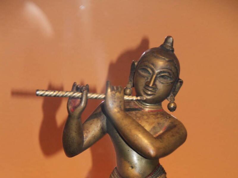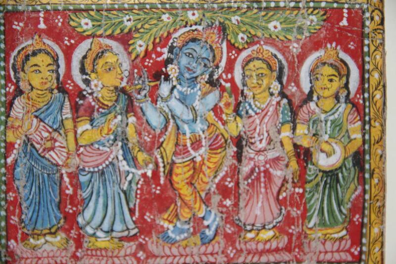The artwork focuses on the Hindu god Vishnu and his incarnation, Krishna. The deities are the most popular recipients of loving devotion, or bhakti.