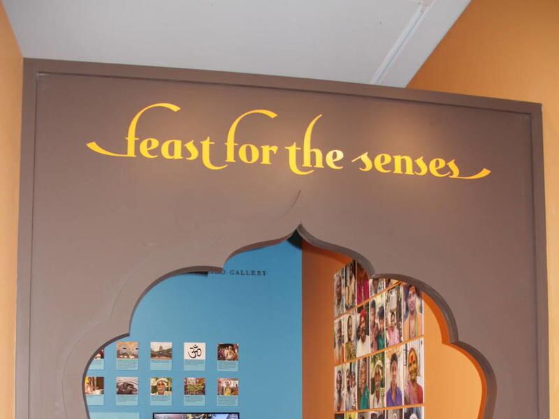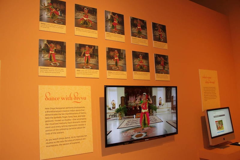 An interactive corner of the exhibition allows younger visitors to learn more about Hinduism and even perform a classical Indian dance that demonstrates the 10 manifestations of Vishnu. Patrons of all ages can also identify their own blessings on paper lotus blossoms. Lotus flowers can float atop muddy waters — even as God’s followers can realize separation from a soiled world.