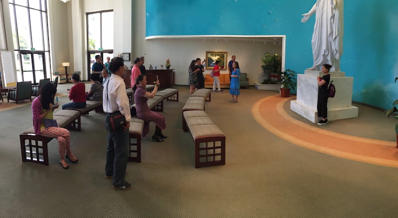 Each incoming crowd is greeted by sister missionaries capable of speaking various languages — Mandarin, Cantonese, Spanish, Korean, Japanese, Tagalog, English and more. If a visitor asks for more information about the gospel of Jesus Christ, the sisters can send their contact information instantaneously by text message to missionaries in the person’s home town, the Swintons said.