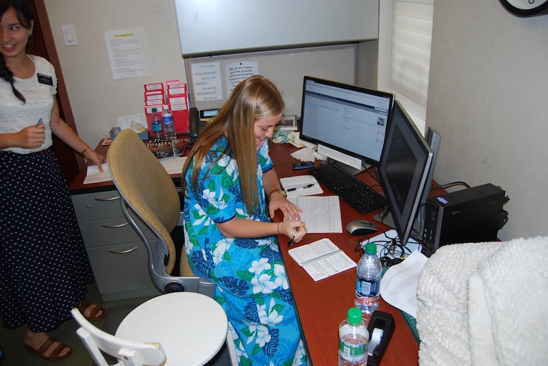 When not greeting visitors, the sisters put on headsets in a small call center where they communicate with people they’ve met on the temple grounds, answer or send referrals, or respond to questions submitted by people online at Mormon.org or other Church websites.