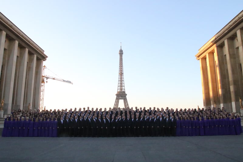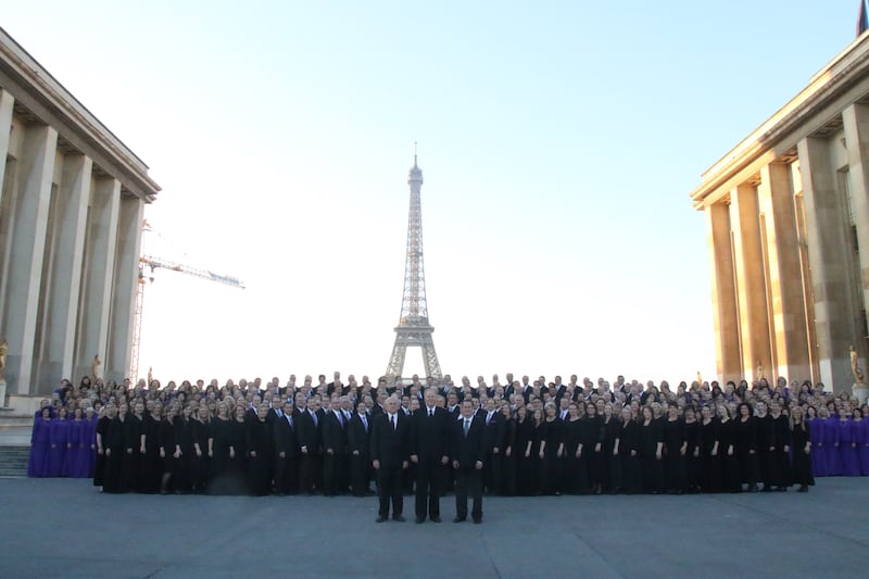 Recreating a historic 1955 photo in front of the Eiffel Tower, the Mormon Tabernacle Choir and Orchestra at Temple Square on July 15 wrapped up a three-week, seven-concert tour of central Europe two days after the last performance in Rotterdam, Holland.