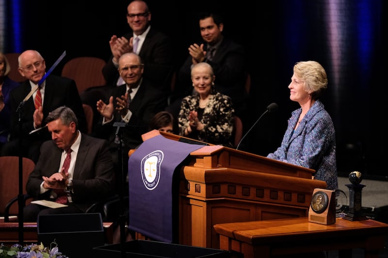 The law society also honored Sister Ruth Lybbert Renlund, wife of Elder Dale G. Renlund, with the Exemplary Leadership Award. Sister Renlund practiced law in Salt Lake City as a civil litigation attorney for more than 20 years and is the former president of the law firm Dewsnup, King and Olsen. She gave the keynote address at the fireside.
