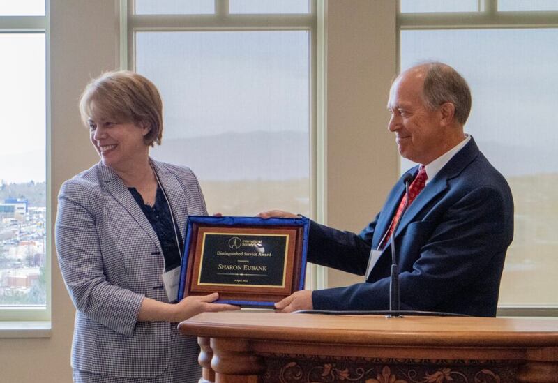 The International Society presented Sister Eubank, first counselor in the outgoing Relief Society general presidency, with its distinguished service award.