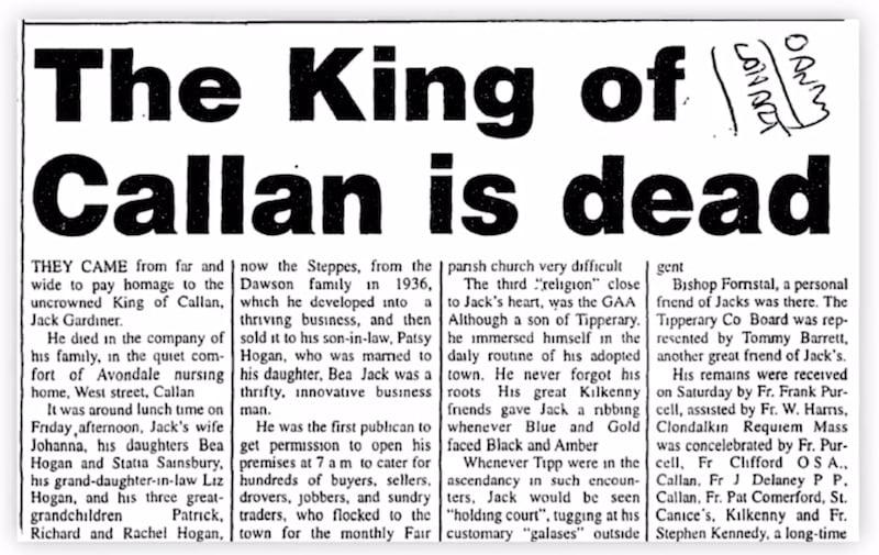 The impact of Jack Gardiner was greater than they had previously known. A photo of their great-grandfather’s obituary illustrated his impact on the people of the town. The headline read “The King of Callan is dead.” Matthew and Michael’s father commented that Jack Gardiner was very good-natured.