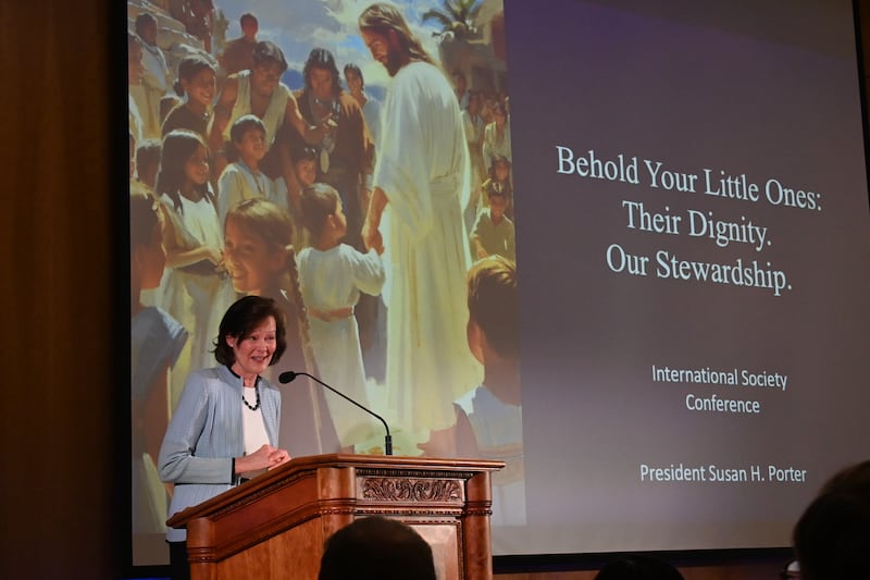 As the keynote speaker at the 36th annual International Society Conference at Brigham Young University, President Porter taught how adults can help children recognize their worth and dignity. She focused her message on the “sacred trust” parents have to nurture, protect and teach children and help them progress in the gospel.