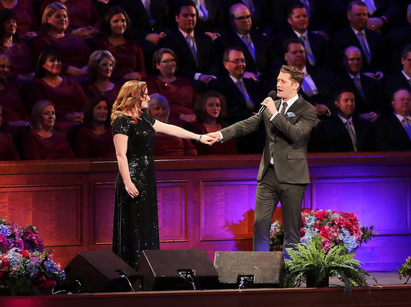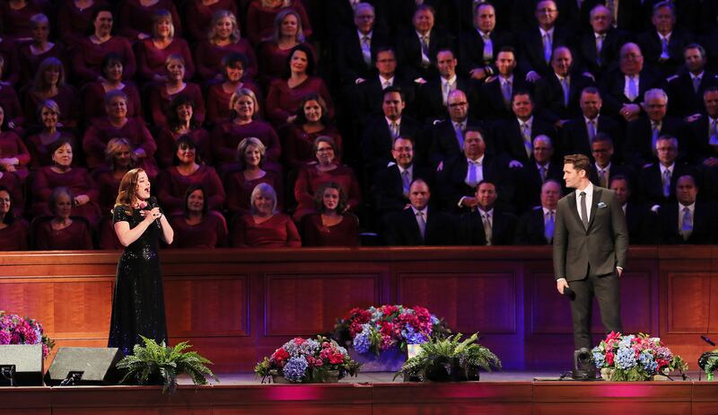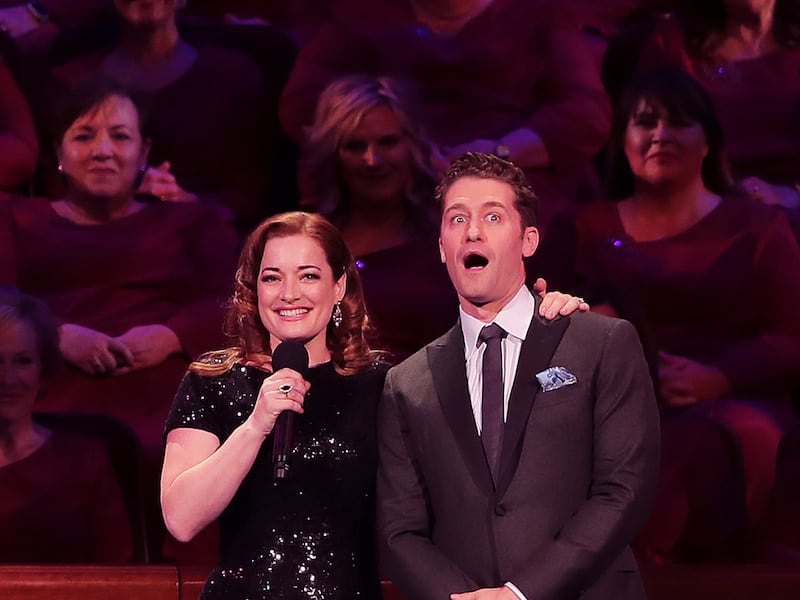 Guest performers Laura Michelle Kellythe and Matthew Morrison perform as they join the Tabernacle Choir for their annual Pioneer Concert at the Conference Center in Salt Lake City with Narrator, Oscar "Andy" Hammerstein III on Friday, July 20, 2018. Credit: Scott G Winterton, Deseret News, Deseret News