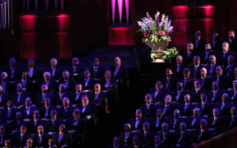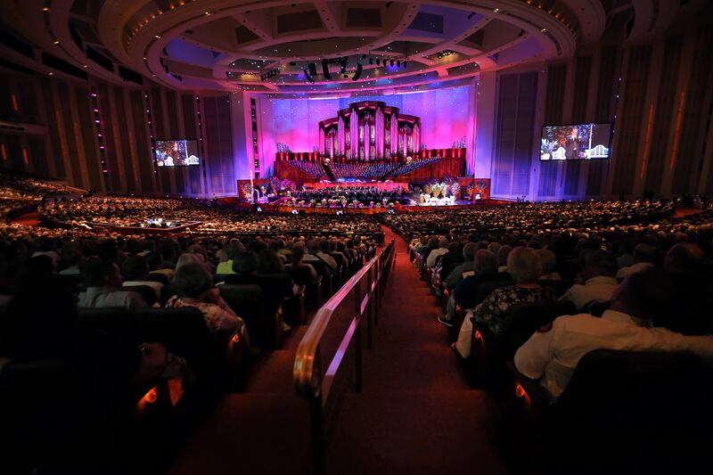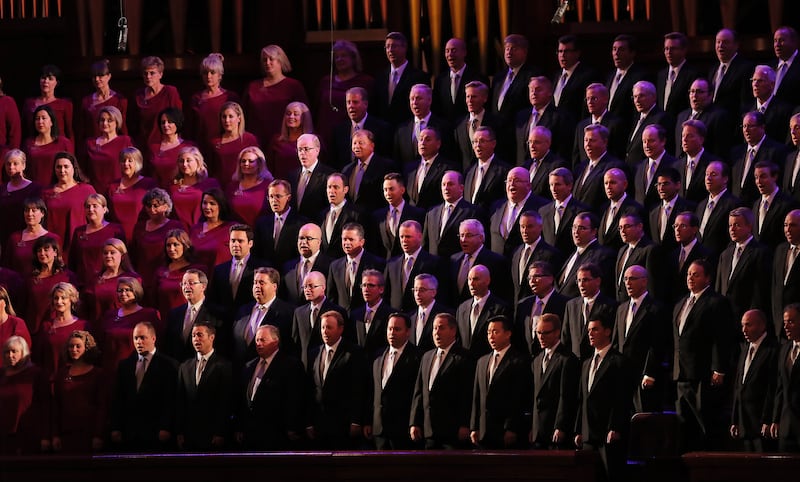 The Tabernacle Choir listen during a song during their annual Pioneer Concert at the Conference Center in Salt Lake City with guest performers Matthew Morrison, Laura Michelle Kelly and Narrator, Oscar "Andy" Hammerstein III on Friday, July 20, 2018. Credit: Scott G Winterton, Deseret News, Deseret News