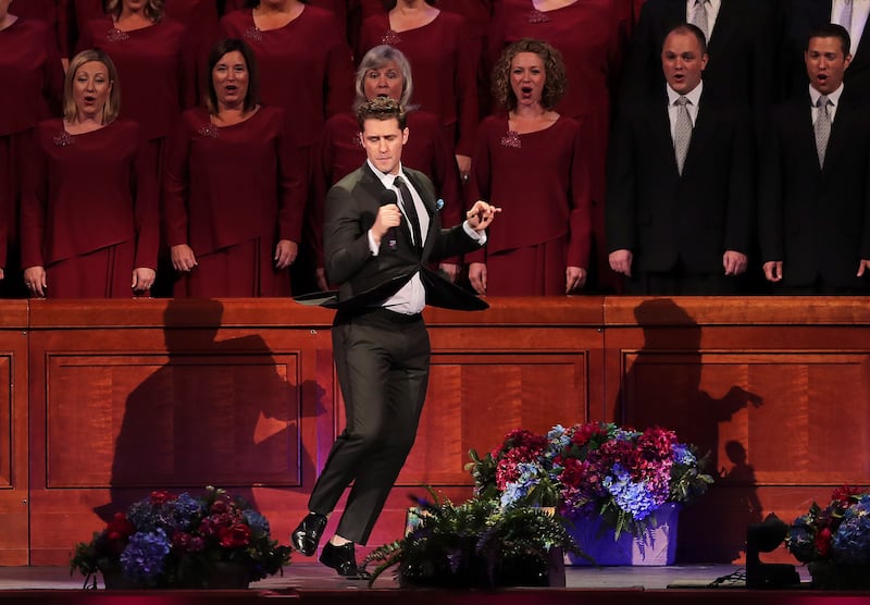 Matthew Morrison spins as he sings as he joins the Tabernacle Choir in their annual Pioneer Concert at the Conference Center in Salt Lake City with other guest performers Laura Michelle Kelly and Narrator, Oscar "Andy" Hammerstein III on Friday, July 20, 2018. Credit: Scott G Winterton, Deseret News, Deseret News