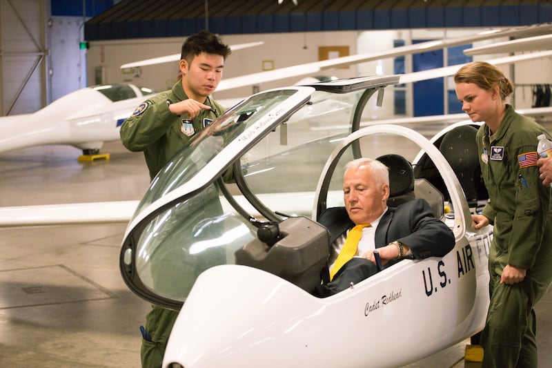 After climbing into a glider and an introduction by Latter-day Saint cadet Julia Pack on how the controls work, Elder Carlson said, “This I would love to do.”